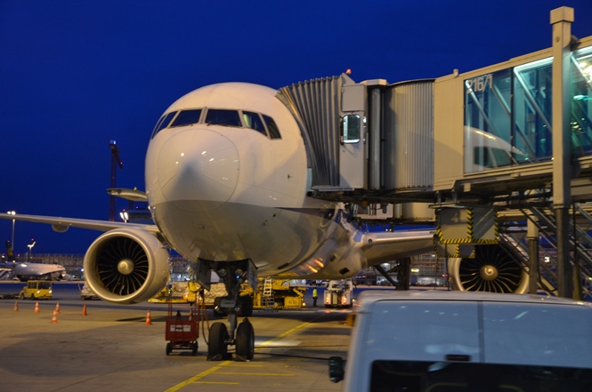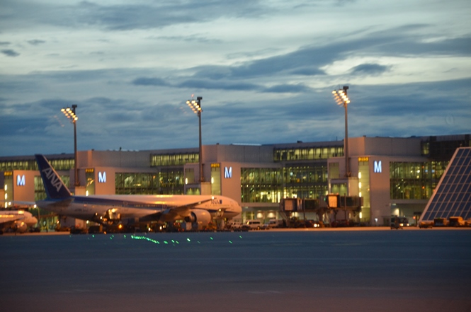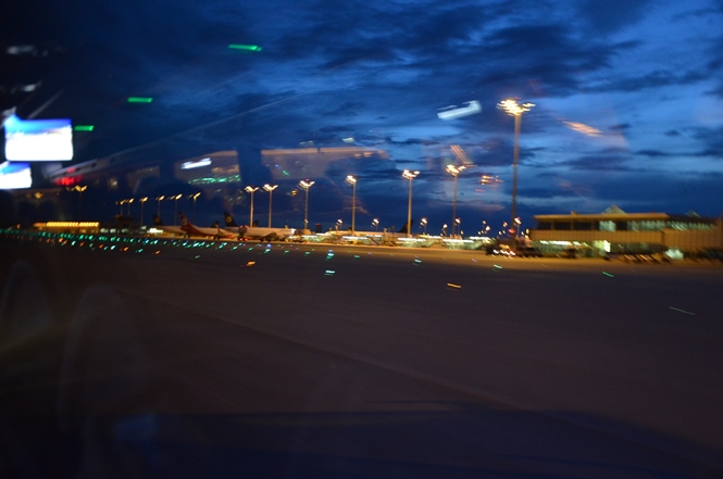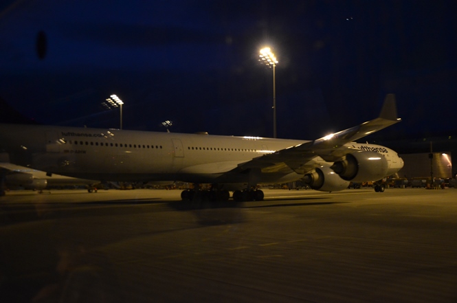 Endlich konnte der Platz im Bus eingenommen werden und nach dem "boarding completed" ging es los: die Fahrt über den Flughafen bei Dämmerung mit tausenden