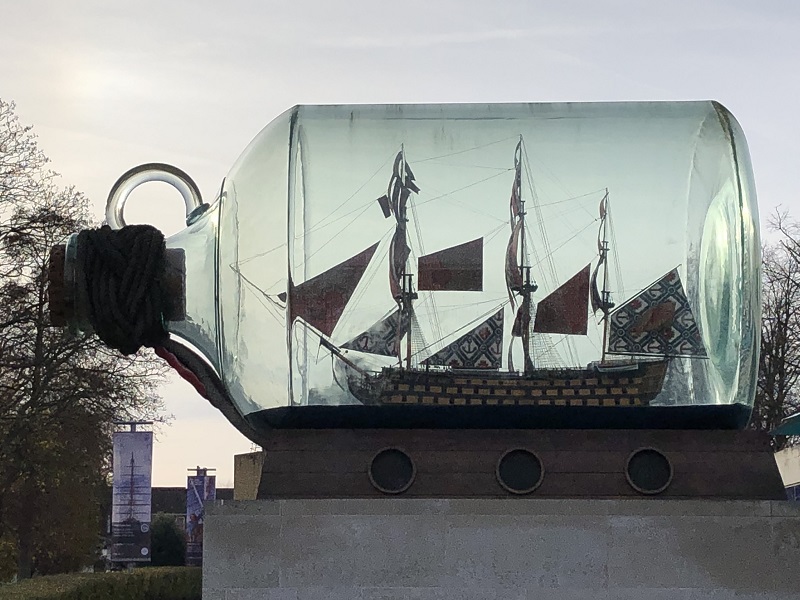Vor dem Gebäude steht das sehenswerte Kunstwerk Nelson's Ship in the Bottle