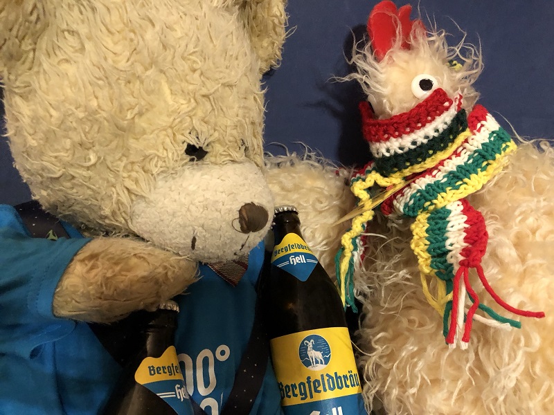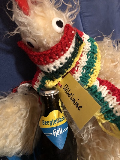 Anfangs war Wilhelmine etwas zurückhaltend, aber so ein Bier lockert dann doch auf - erst recht, nachdem Wilhelmine den Mundschutz abgenommen hat (ein
